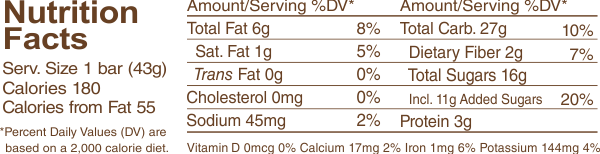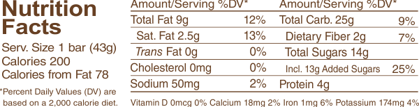 INGREDIENTS:ORGANIC BROWN RICE SYRUP, ROASTED PEANUTS (PEANUTS, VEGETABLE OIL [PEANUT AND/OR SUNFLOWER SEED OIL], SALT), SEMI-SWEET CHOCOLATE CHIPS (SUGAR, CHOCOLATE, MILKFAT, COCOA BUTTER, SOY LECITHIN, NATURAL FLAVORS), WHOLE GRAIN OATS, SUNFLOWER SEEDS, ORGANIC AGAVE SYRUP, RICE CEREAL (MILLED RICE, CANE SUGAR, SALT, BARLEY MALT, MIXED TOCOPHEROLS [VITAMIN E] [SOY], VITAMIN AND MINERALS [FERRIC ORTHOPHOSPHATE, ASCORBIC ACID, NIACINAMIDE, VITAMIN A PALMITATE, FOLIC ACID, ZINC OXIDE, CYANOCOBALAMIN, PYRIDOXINE HYDROCHLORIDE, RIBOFLAVIN, THIAMINE MONONITRATE, CHOLECALCIFEROL]), BROWN SUGAR.